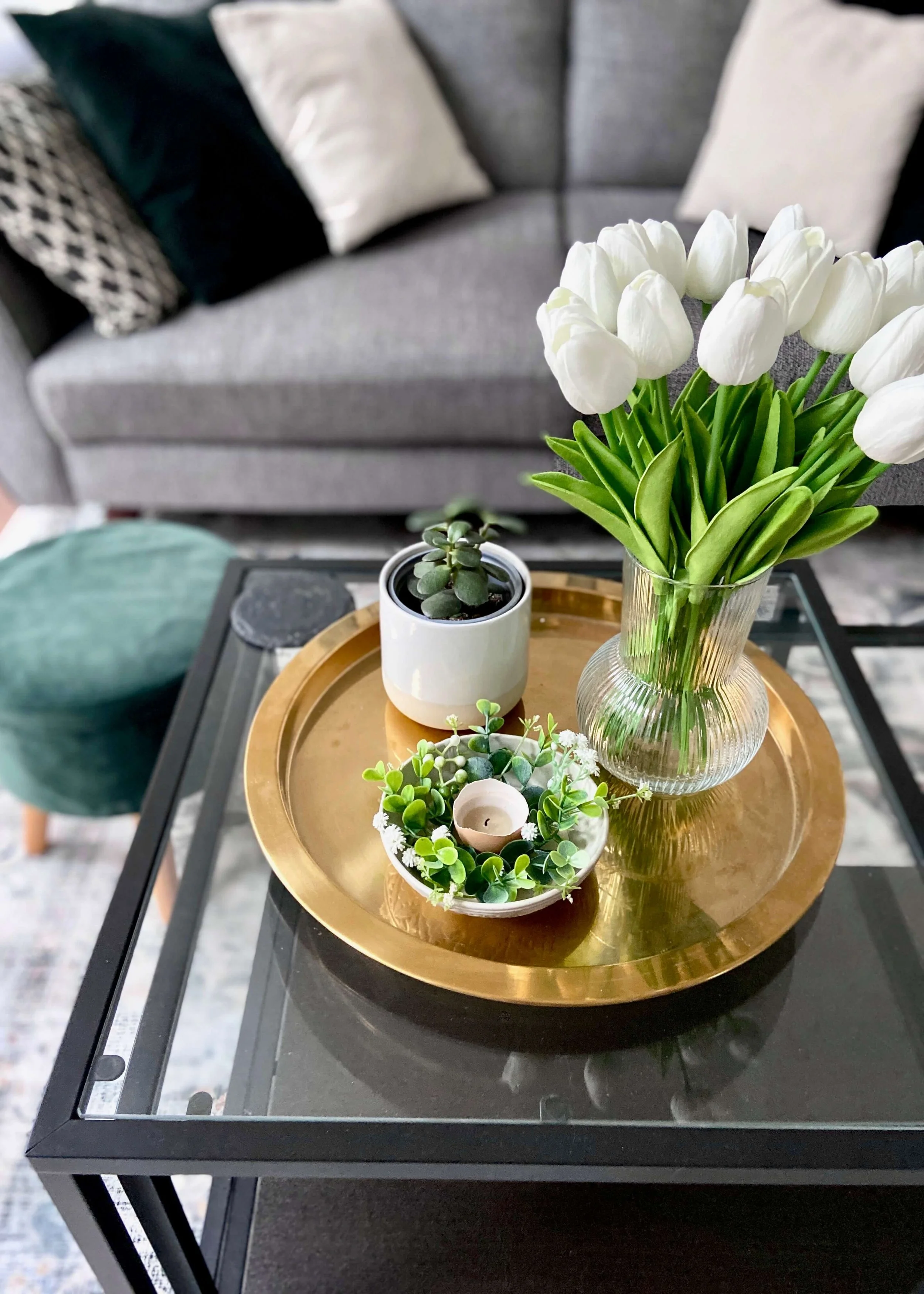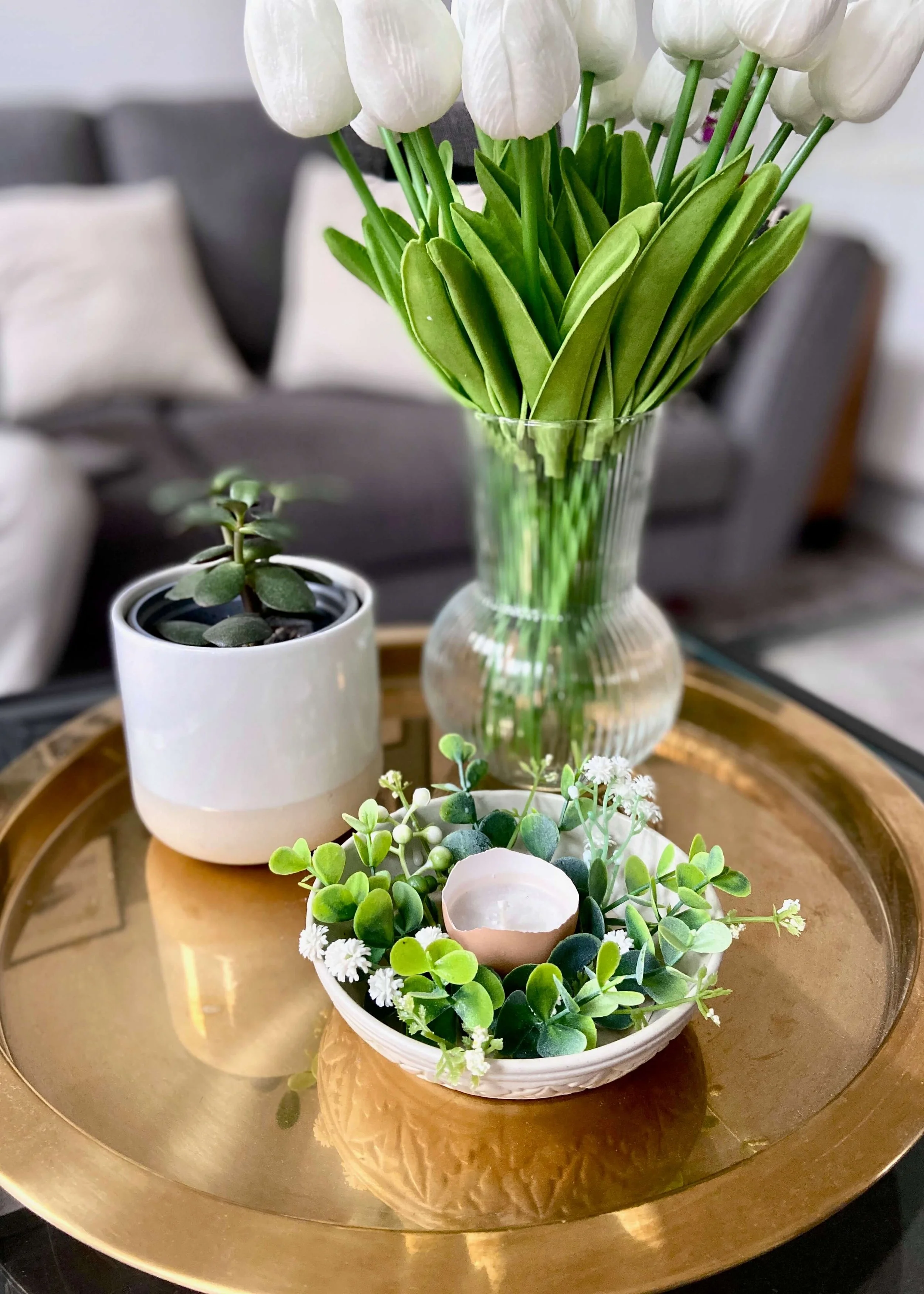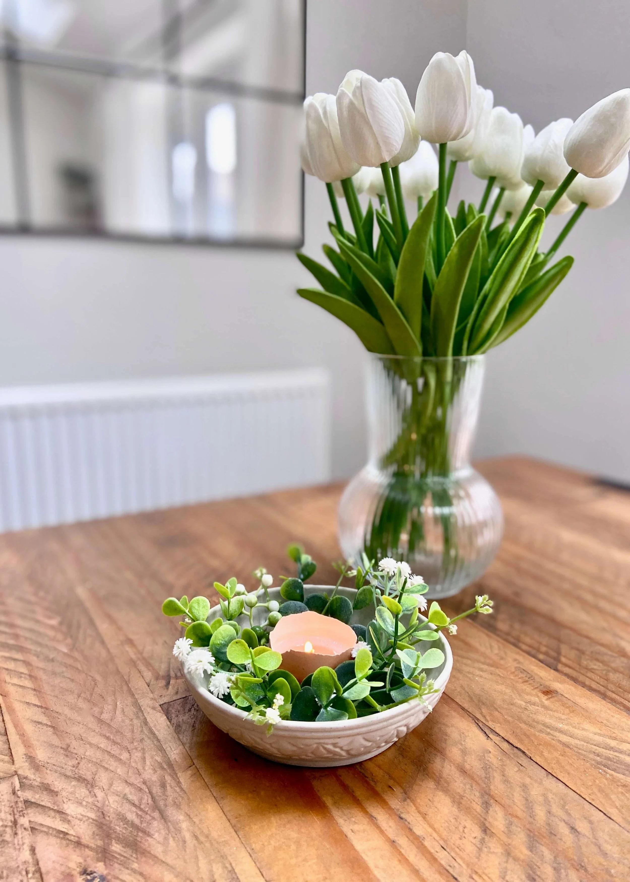 It’s not feeling quite so Spring-like at the moment but just a couple of weeks ago it really felt like it was in the air. It made me want to change up my decor and so I put away the wintry foliage on the mantlepiece and stairs, and I bought these lovely artificial white tulips. They look pretty realistic and I’m allergic to everything so it’s really nice to have the fresh flower feeling without the itchy eyes. I’ve seen a lot of eggshell DIYs and crafts over the years, and have in the past used them as a mould for these plaster egg ornaments, but this time I really wanted to use the shell themselves. I wanted to use this lovely dish a friend bought me a few years ago, alongside some leftover foliage from the wedding, and this is what I came up with. I think it’s so cute and is perfect as a centrepiece on my coffee table next to my tulips. What do you think? If you love this as much as me, don’t forget to follow me on instagram and subscribe! Keep reading for the step by step guide…