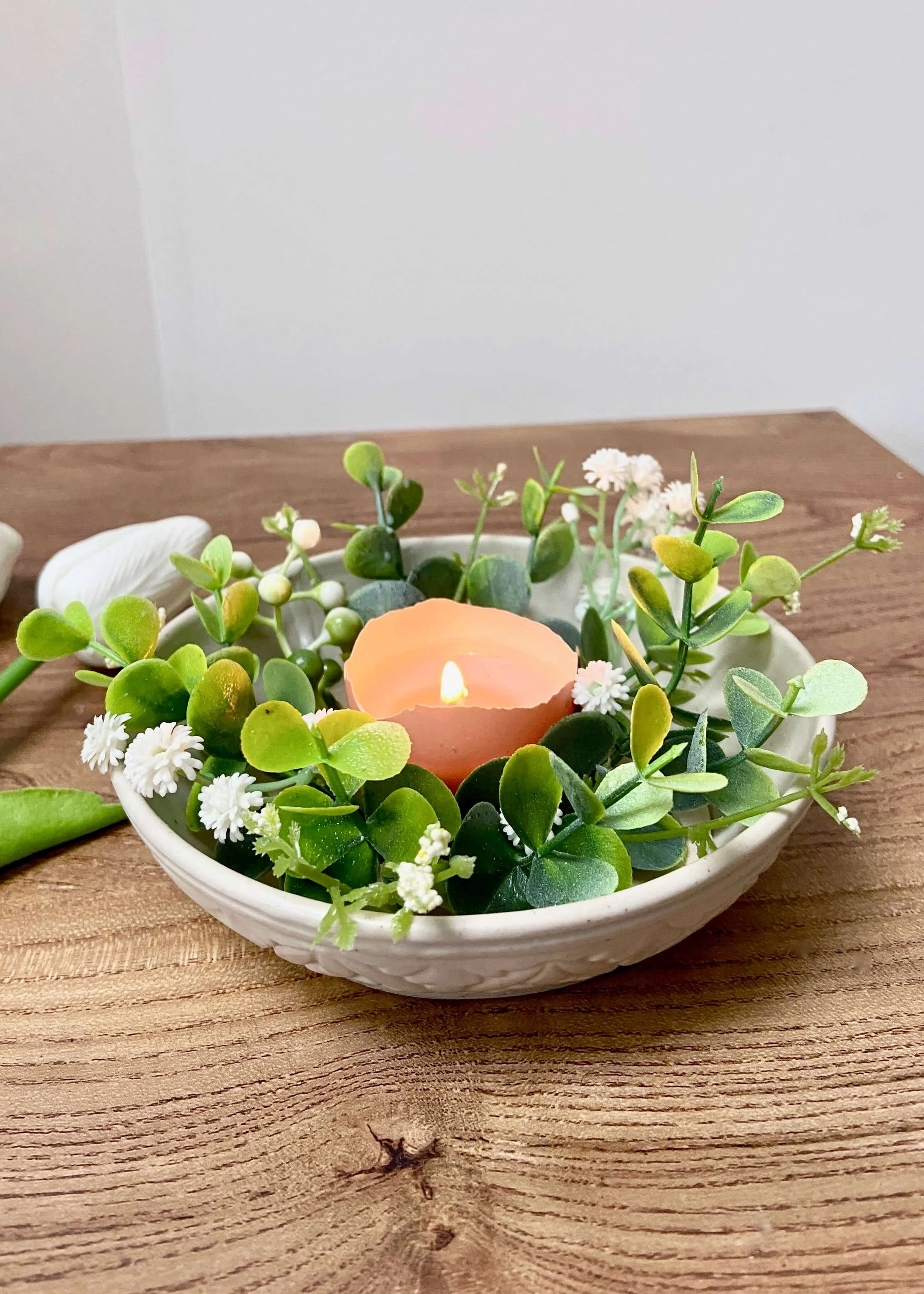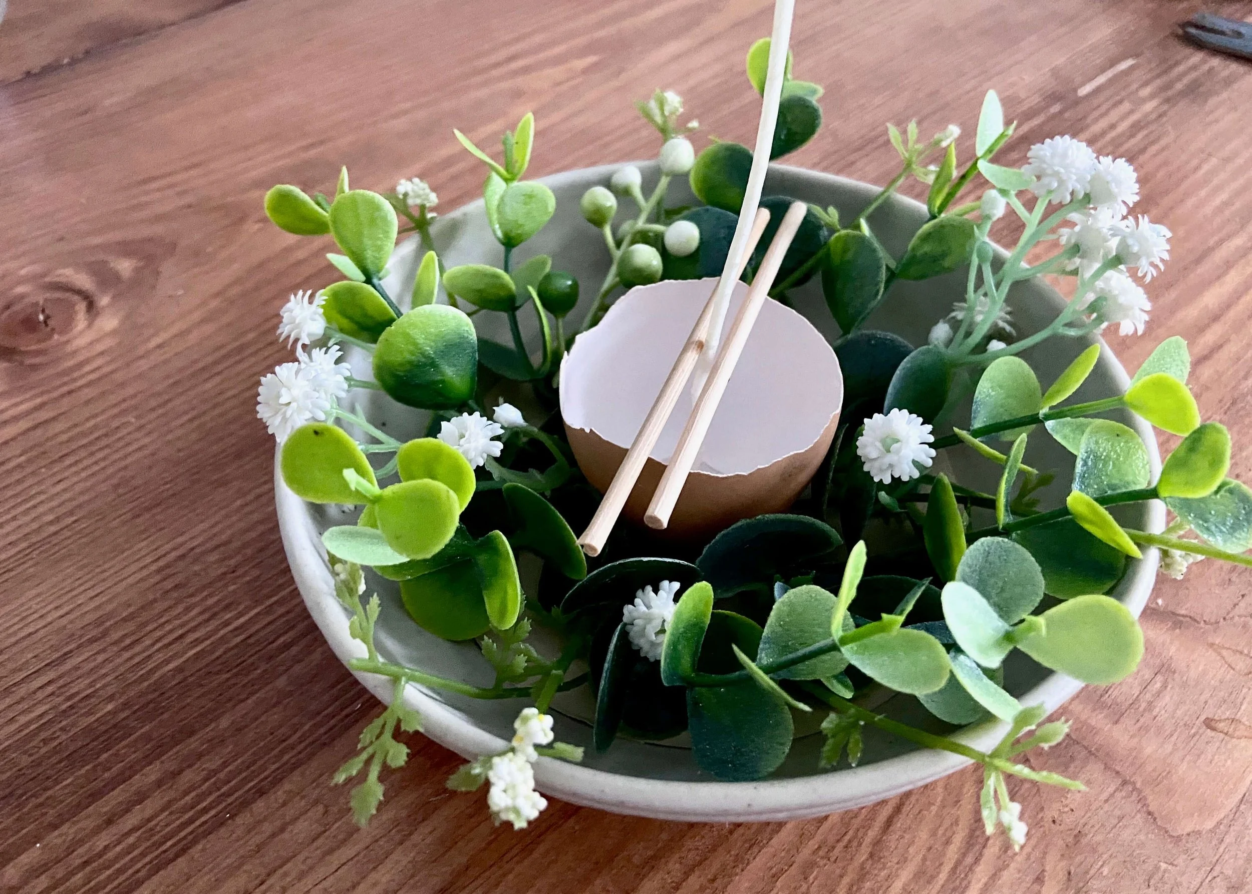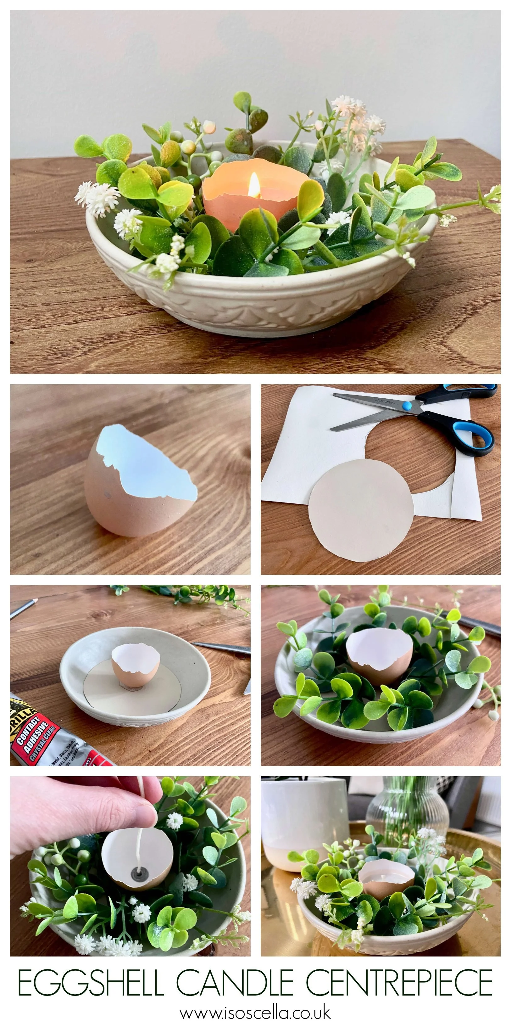 Create a beautiful centrepiece for Spring or Easter using eggshells, old wax and foliage!