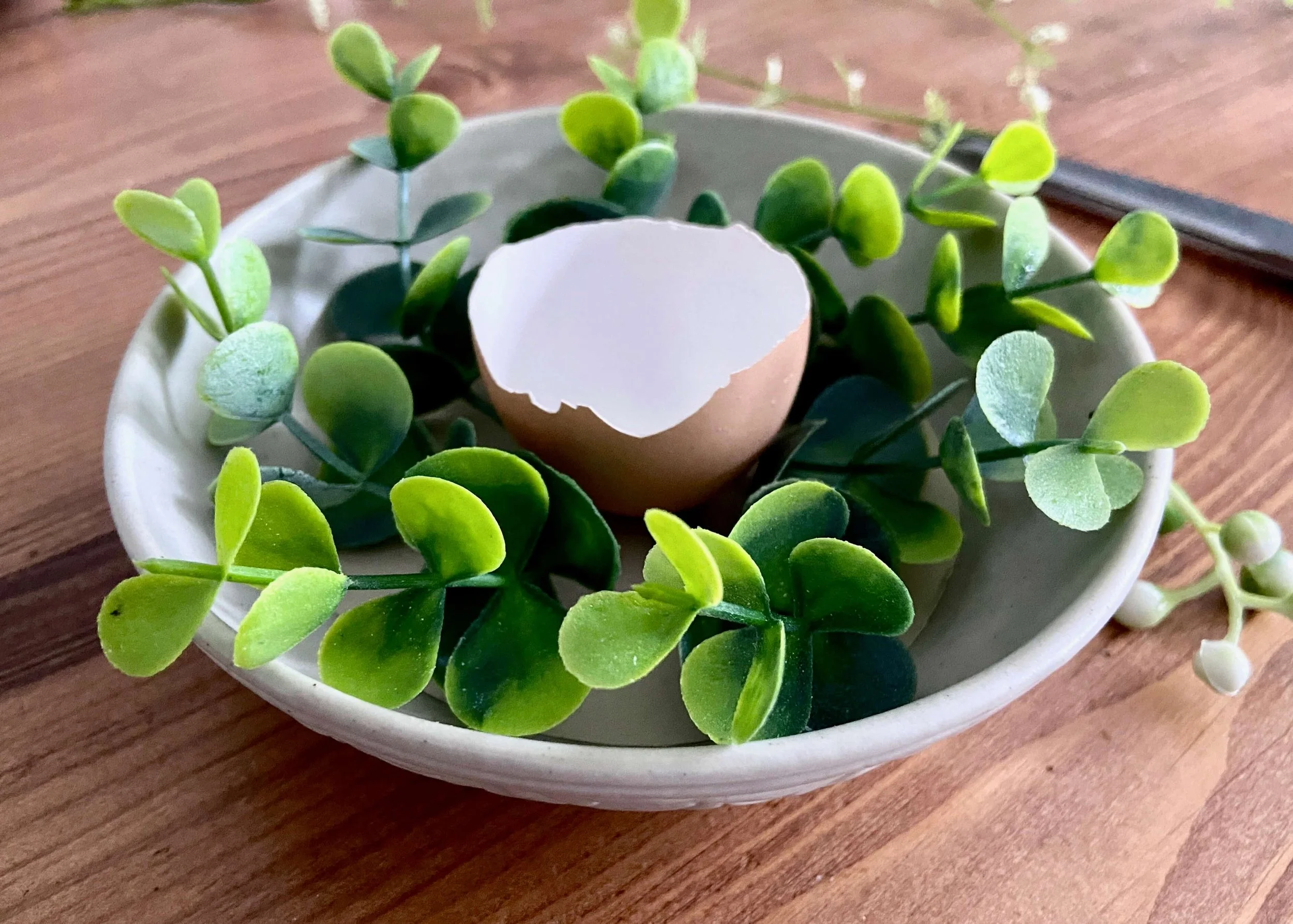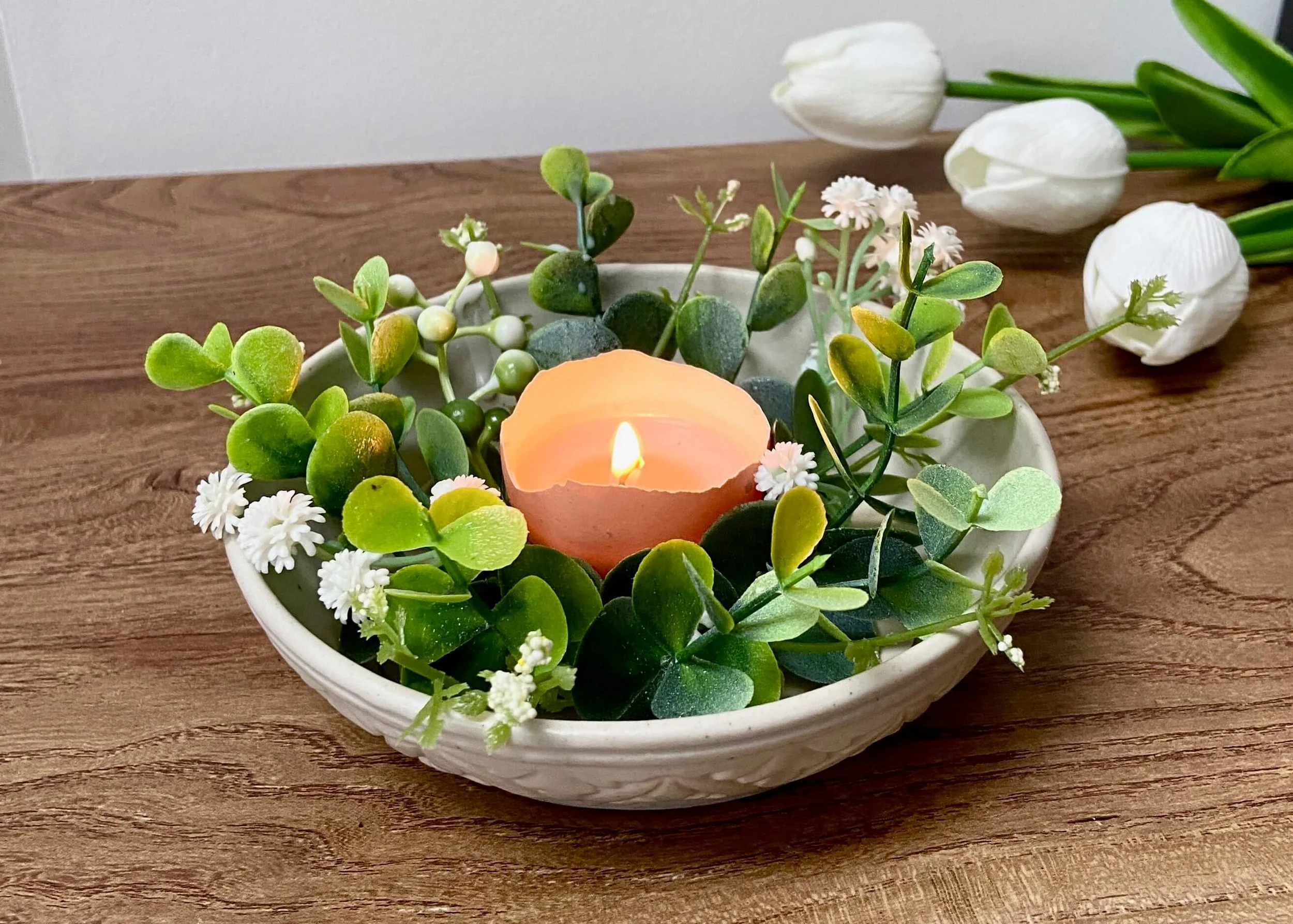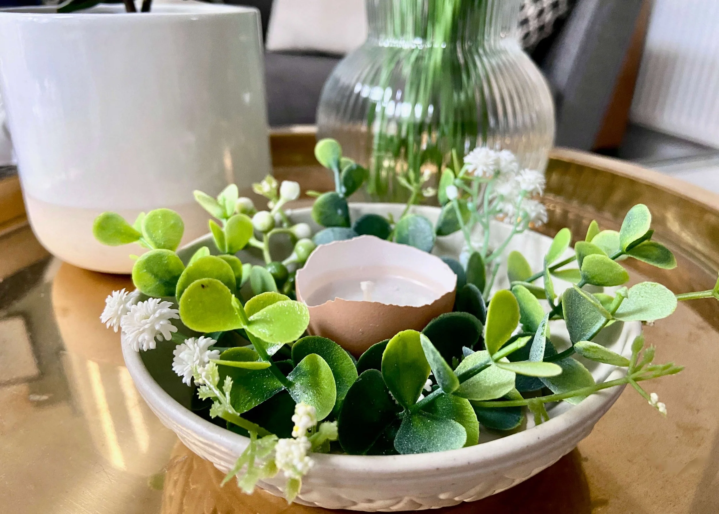 Create a beautiful centrepiece for Spring or Easter using eggshells, old wax and foliage!