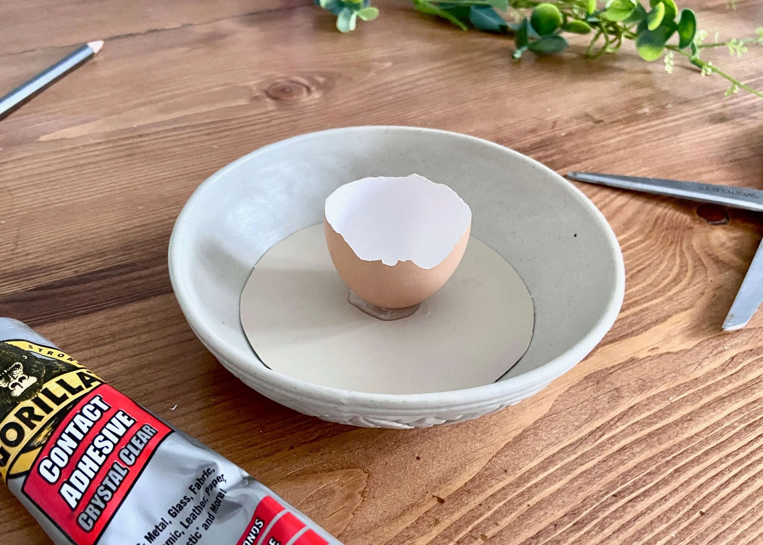 I then grabbed some super glue and contact adhesive and stuck my egg shell into the centre of the dish on the cardstock.